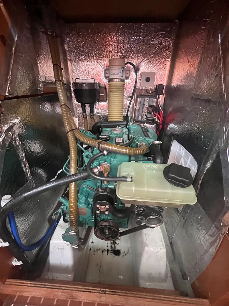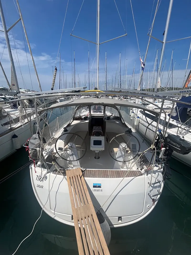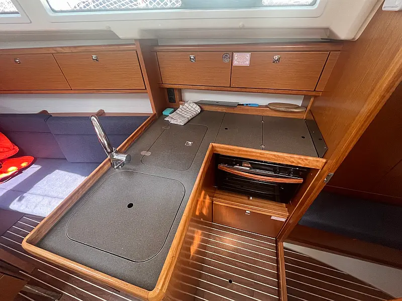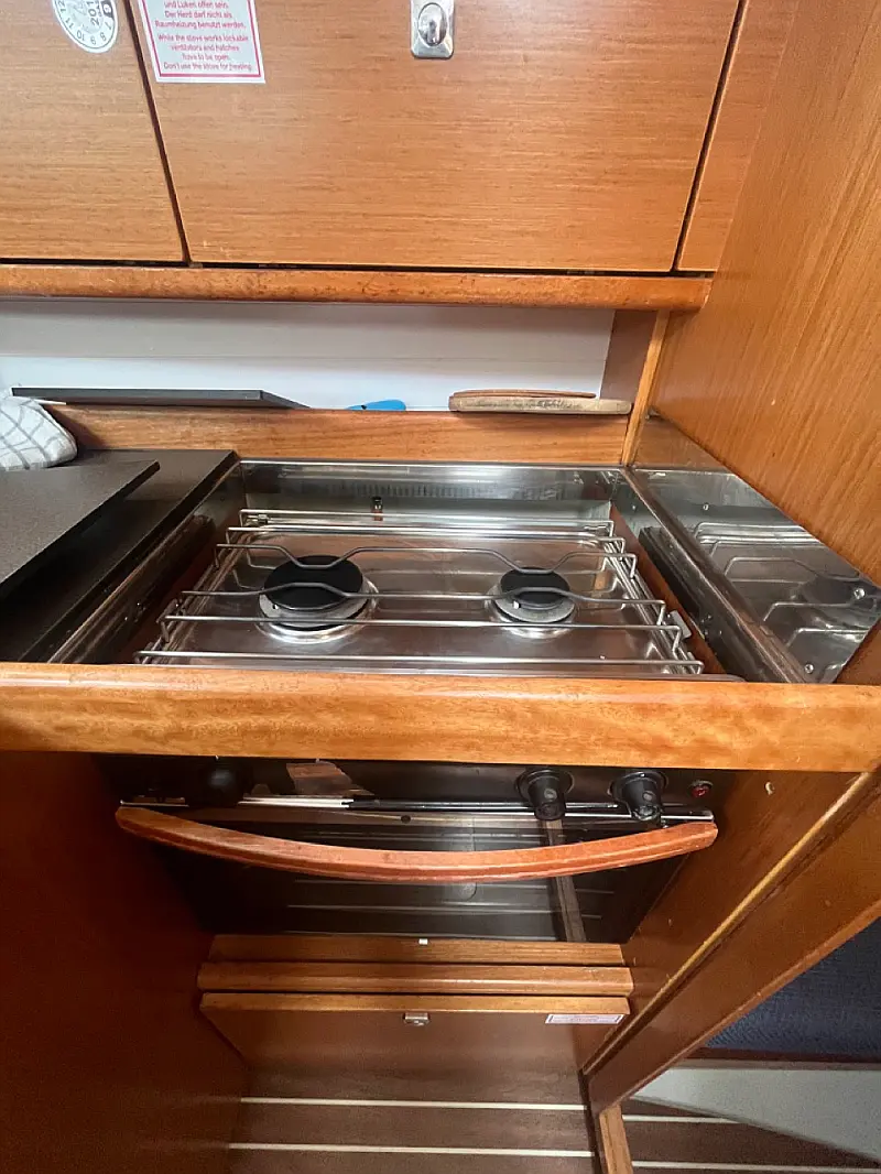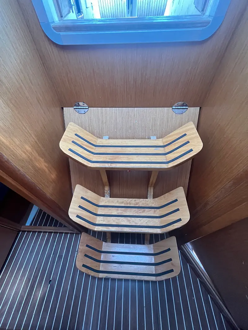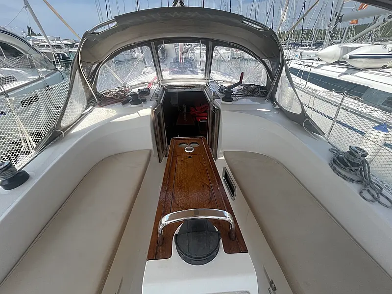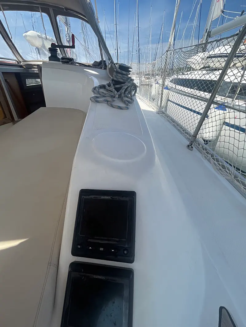 GPS + CHART PLOTTER IN COCKPIT, Solar panels, Blue underwater lights, Bed linen, Wind direction indicator, Byboat pump (true), Water hose, Brush (true), Bilge pump + handle, Charts, Plotters + dividers, Hand bearing compass, Binoculars, Pilot books, Life jackets, First aid kit, Portable lamp, Tools, Clock, Barometer, Kitchen equipment, Echo sounder, Speed log, VHF, Radio CD player, Electric windlass, Wind instrument, Winch handles (2), Anchor with chain (2), Fenders (6), Gas bottle (2), Ropes, Boat hook, Life buoy, Hot water, Cockpit table, Roll Genoa, Tender, Bimini top, Sprayhood, Autopilot