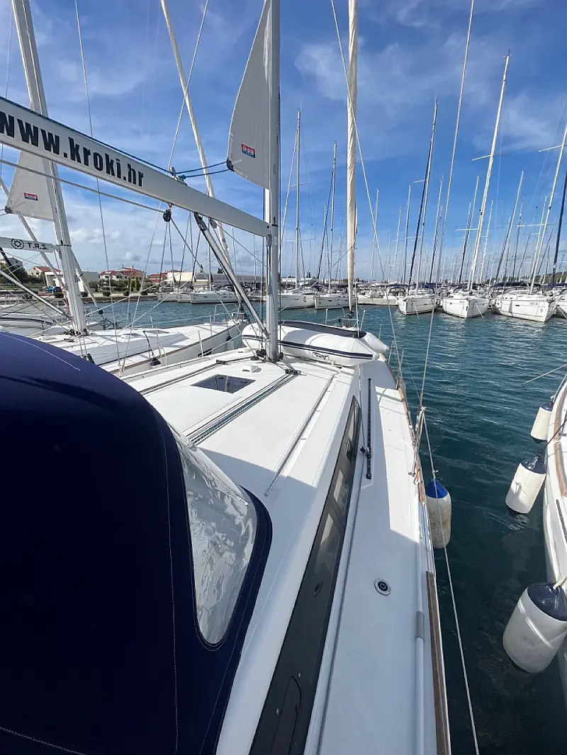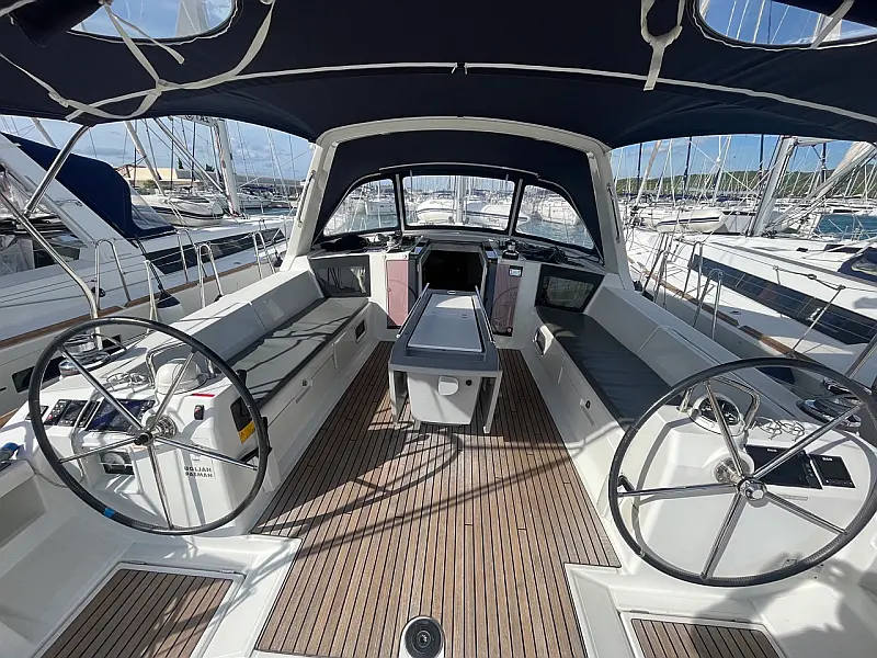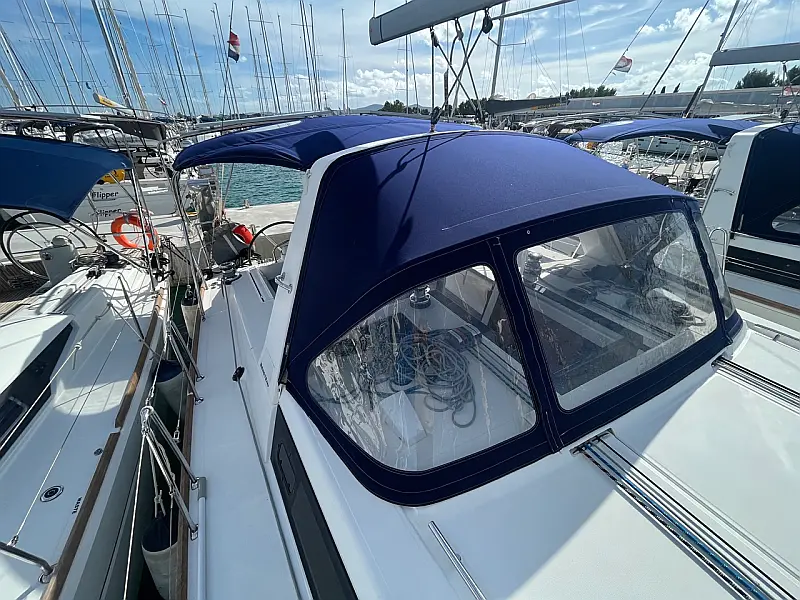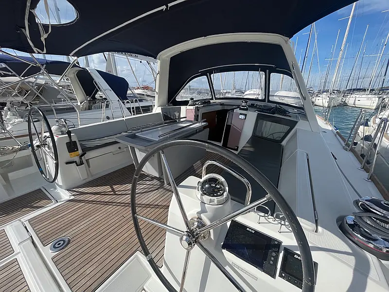 Cockpit cushions GPS + CHART PLOTTER IN COCKPIT, Solar panels, Blue underwater lights, Bed linen, Wind direction indicator, Byboat pump (true), Water hose, Brush (true), Bilge pump + handle, Charts, Plotters + dividers, Binoculars, Life jackets, First aid kit, Portable lamp, Tools, Clock, Barometer, Kitchen equipment, Echo sounder, Speed log, VHF, Electric windlass, Wind instrument, Winch handles (2), Anchor with chain (2), Fenders (6), Gas bottle (2), Ropes, Boat hook, Life buoy, Bow thruster, Heating, Hot water, Cockpit table, Roll Genoa, Tender, Bimini top, Sprayhood, Autopilot