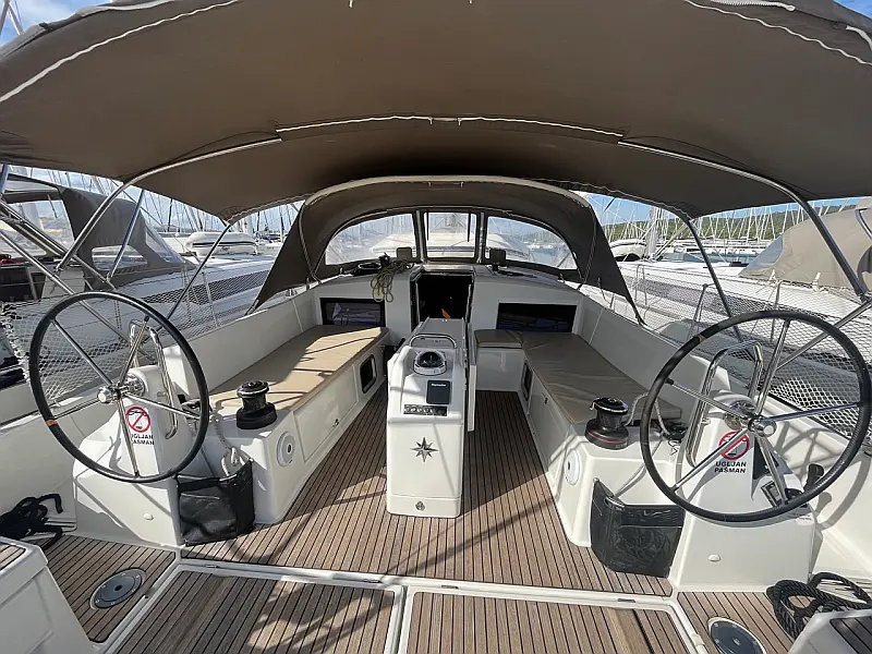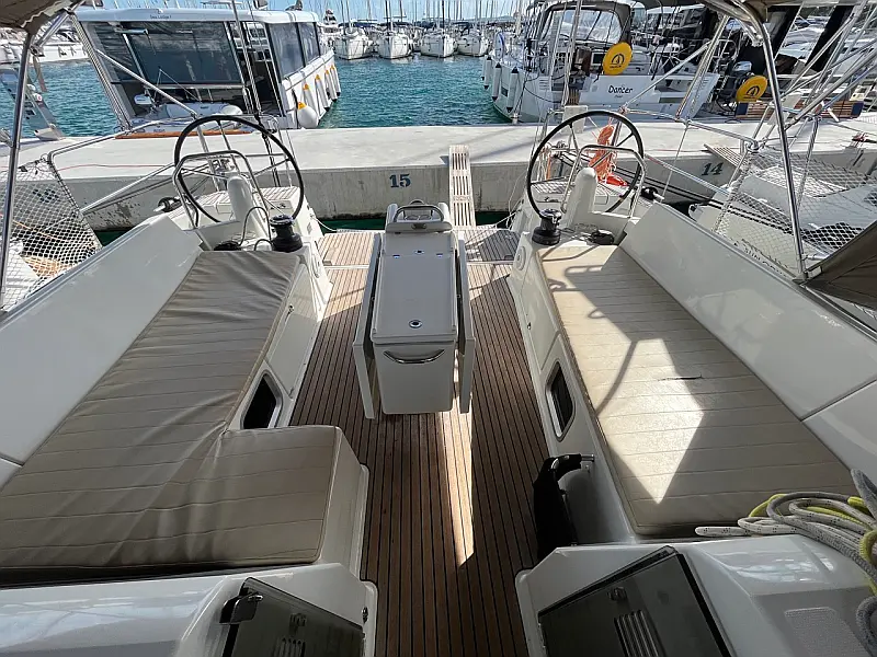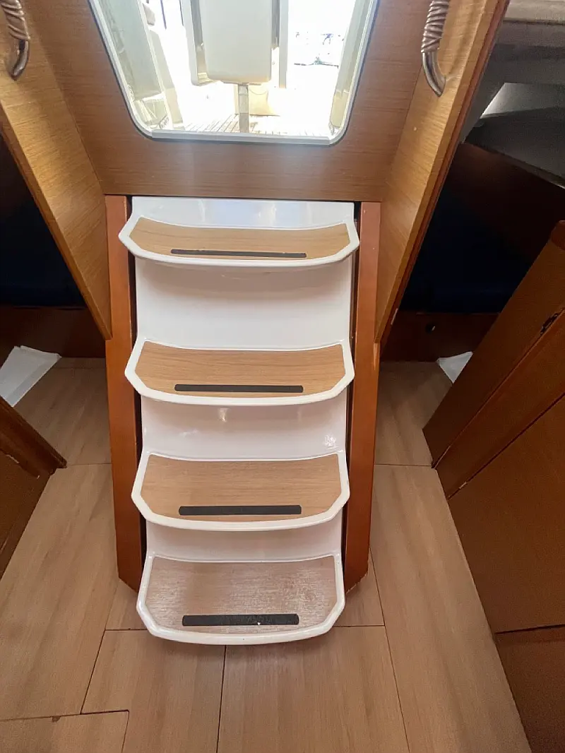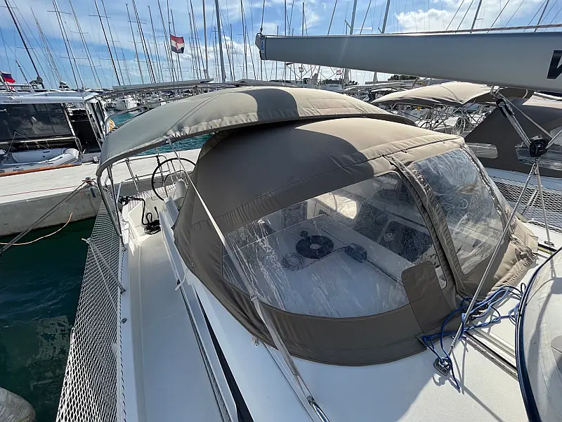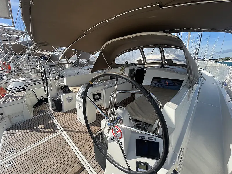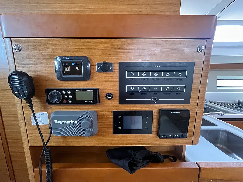GPS + CHART PLOTTER IN COCKPIT, Engine (1), Solar panels, Blue underwater lights, Bed linen, Cockpit speakers, CD Player, Wind direction indicator, Byboat pump (true), Brush (true), Bilge pump + handle, Charts, Plotters + dividers, Binoculars, Pilot books, Life jackets, First aid kit, Clock, Barometer, Kitchen equipment, Speed log, Electric windlass, Wind instrument, Winch handles (2), Gas bottle (2), Ropes, Boat hook, Air conditioning, Teak cockpit, Bow thruster, Hot water, Cockpit table, Roll Genoa, Bimini top, Sprayhood, Autopilot