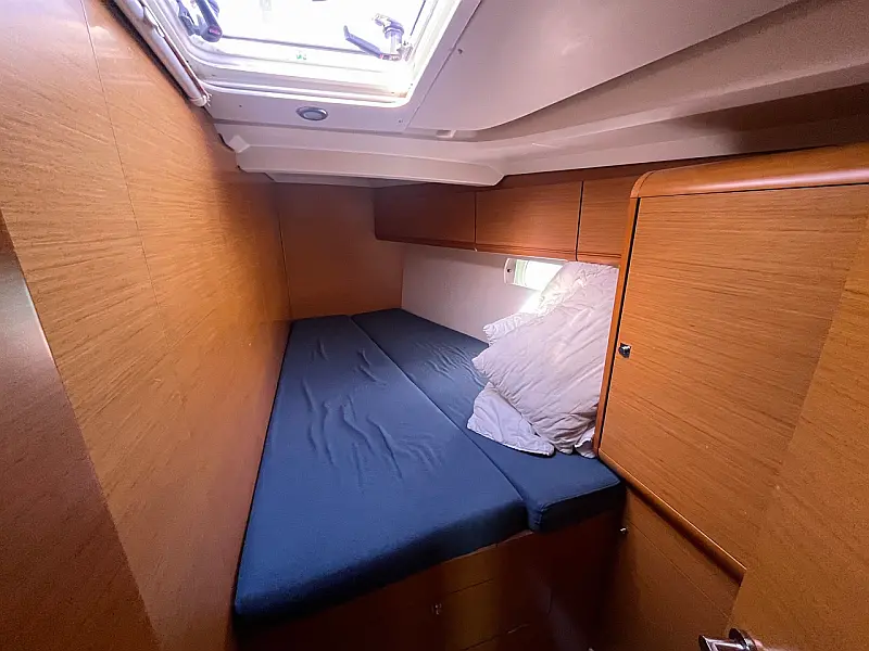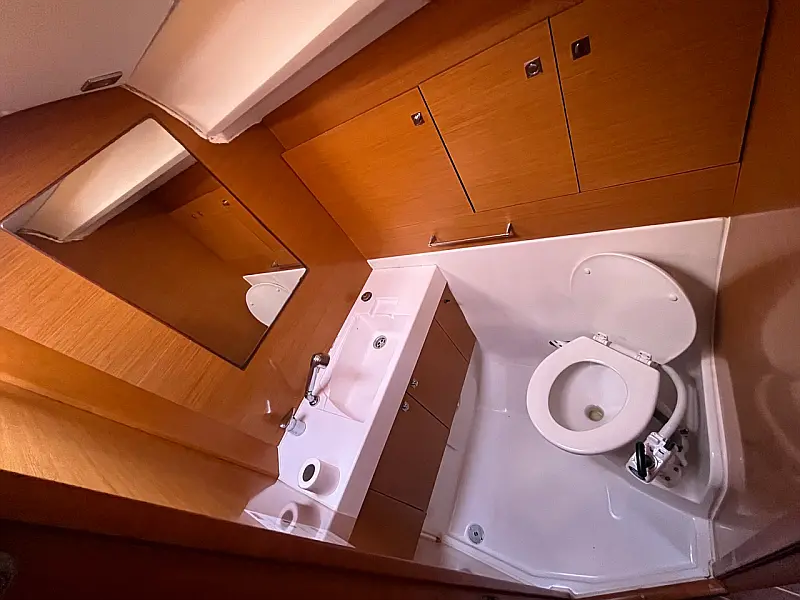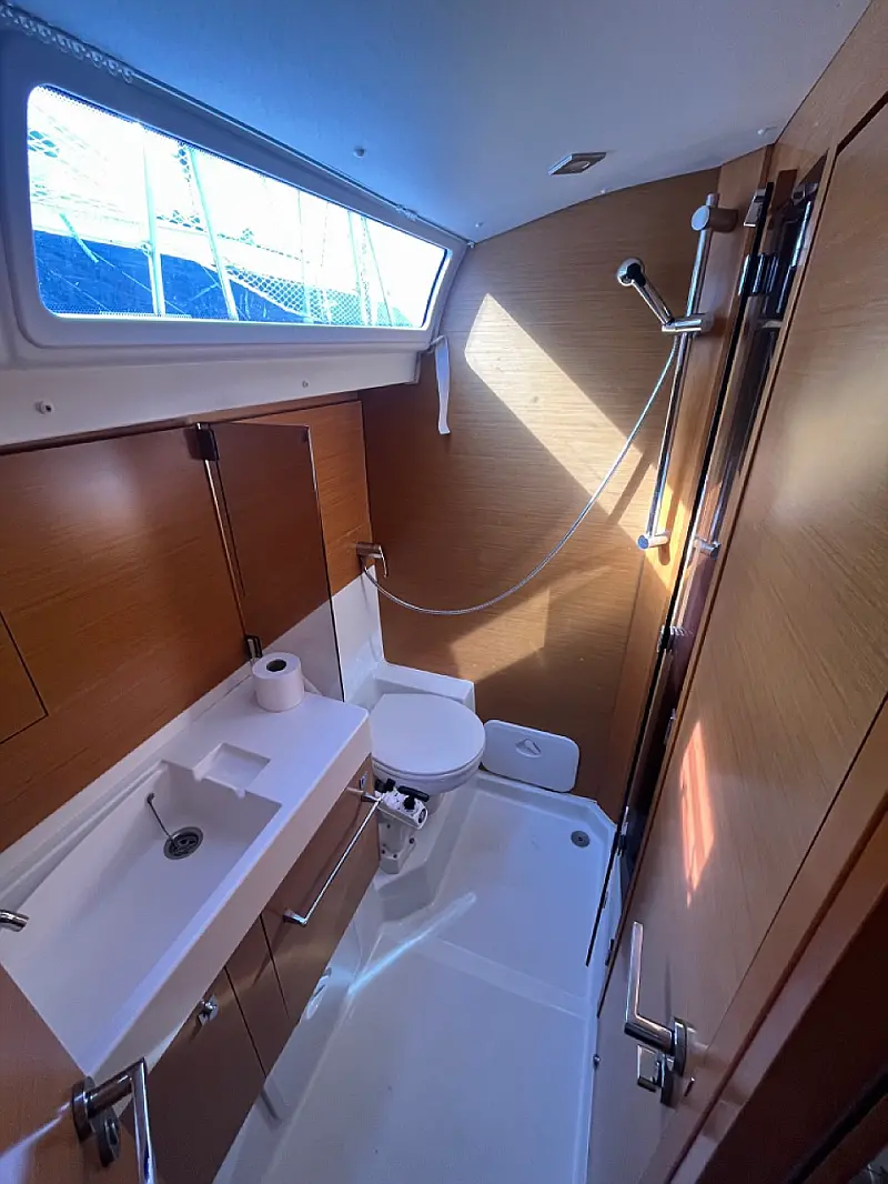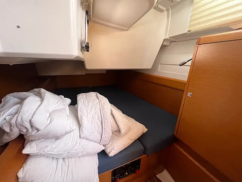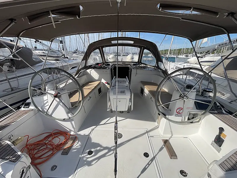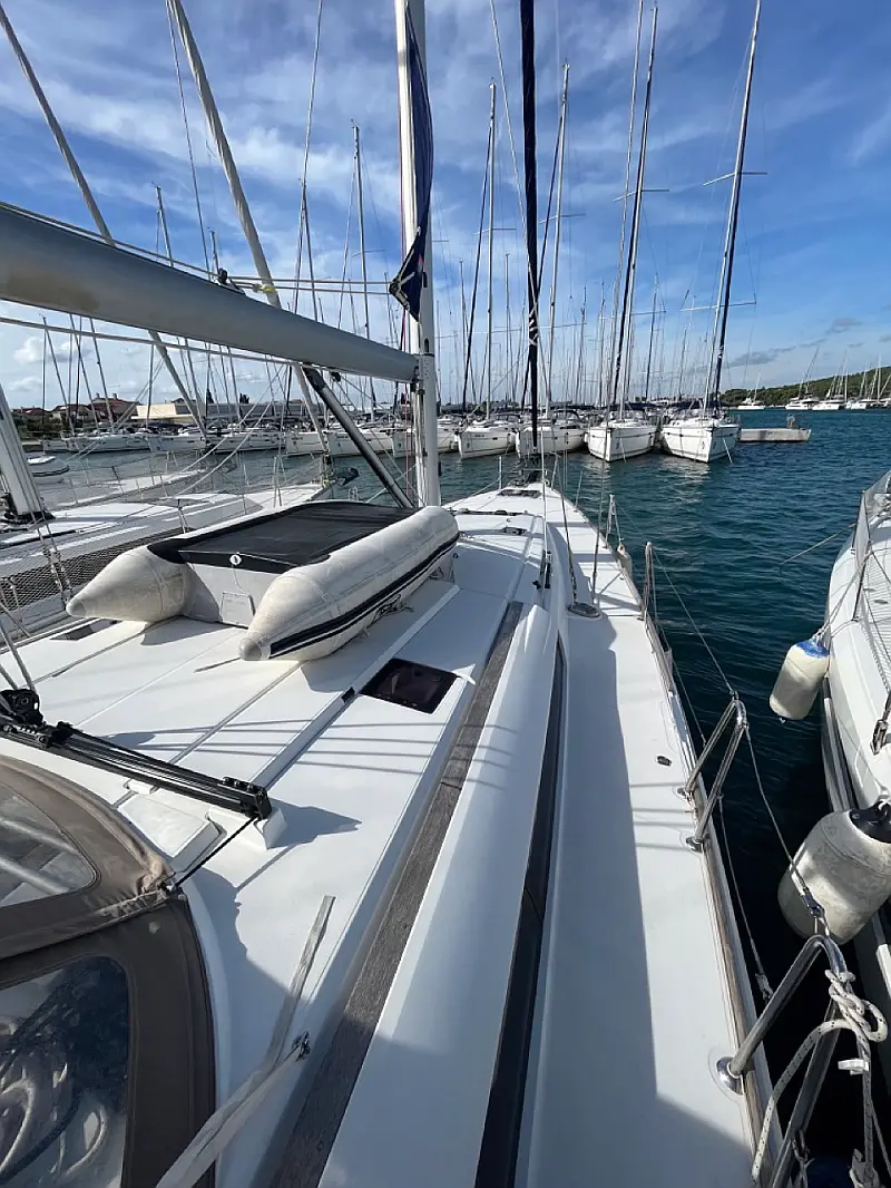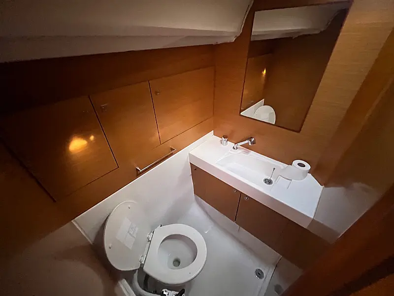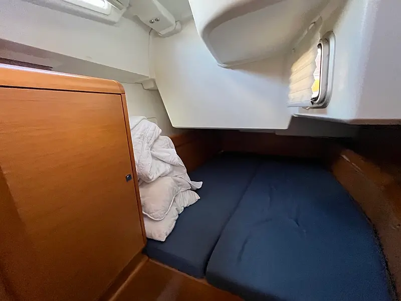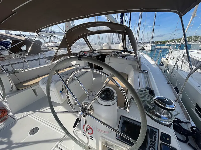 GPS + CHART PLOTTER IN COCKPIT, Solar panels, Blue underwater lights, Bed linen, CD Player, Wind direction indicator, Byboat pump (true), Water hose, Brush (true), Bilge pump + handle, Charts, Plotters + dividers, Binoculars, Life jackets, First aid kit, Portable lamp, Tools, Clock, Barometer, Kitchen equipment, Echo sounder, Speed log, VHF, Radio CD player, Electric windlass, Wind instrument, Winch handles (2), Anchor with chain (2), Fenders (6), Gas bottle (2), Ropes, Boat hook, Life buoy, Bow thruster, Hot water, Cockpit table, Roll Genoa, Tender, Bimini top, Sprayhood, Autopilot