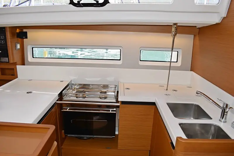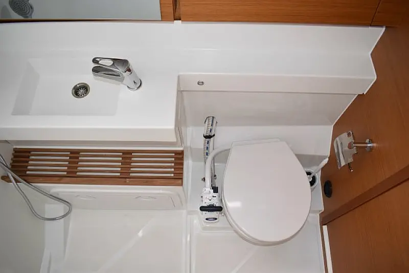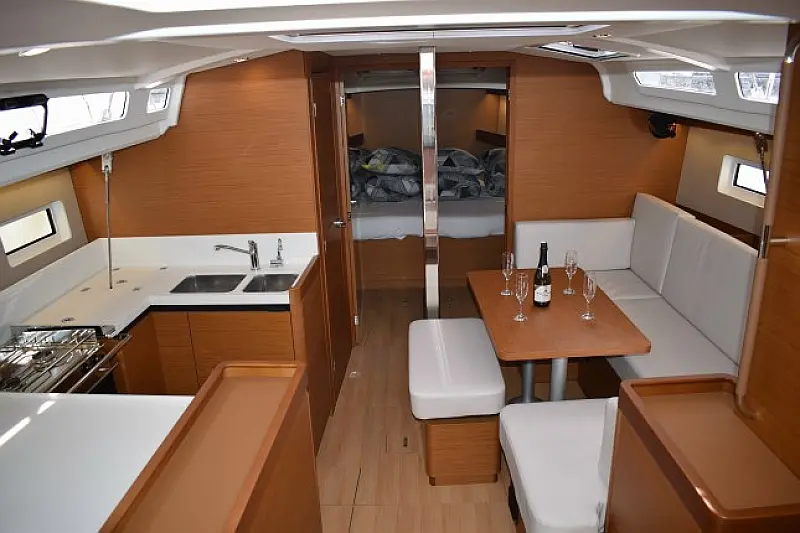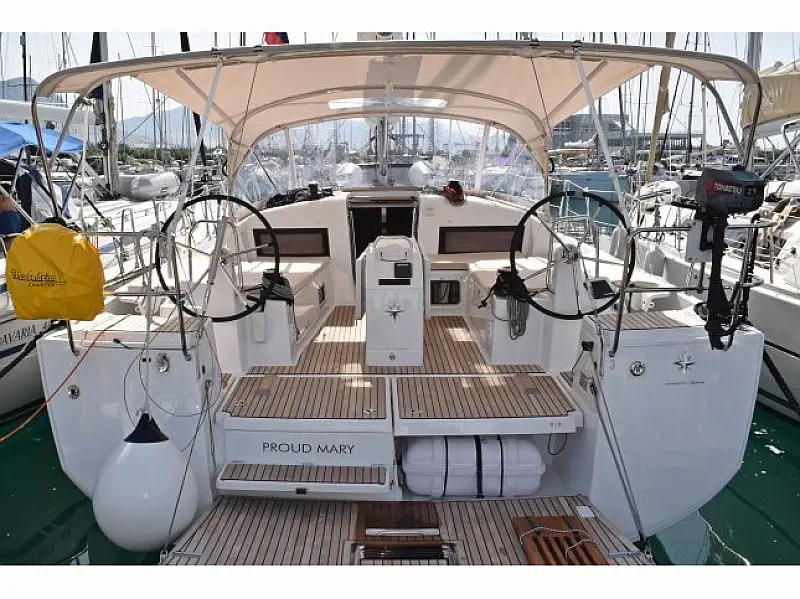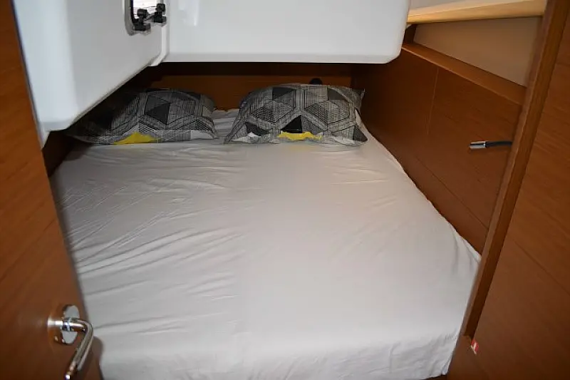 GPS + CHART PLOTTER IN COCKPIT, Bed linen, Dinghy, VHF, Radio CD player, Bow thruster, Roll Genoa, Bimini top, Sprayhood, Autopilot, Bathing platform, Water heater, Cockpit shower, Semi full batten main sail