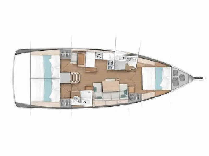 GPS + CHART PLOTTER IN COCKPIT, Inverter 12/220V 50HZ-2000VA, Cockpit cushions, Dinghy, Electric toilets, Fans in saloon and cabins, Webasto heating, Cockpit speakers, Bilge pump + handle, Charts, Hand bearing compass, Binoculars, Life jackets, First aid kit, Barometer, VHF, Radio CD player, Electric windlass, Wind instrument, Winch handles (2), Fenders (8), Air conditioning, Teak cockpit, Bow thruster, Cockpit table, Roll Genoa, Bimini top, Sprayhood, Autopilot, Bathing platform, Indoor speakers, Water heater, Cockpit shower, Gangway, Kitchen utensils (Galley equipment, cutlery), Oven, Refrigerator, Gas cookers, Semi full batten main sail