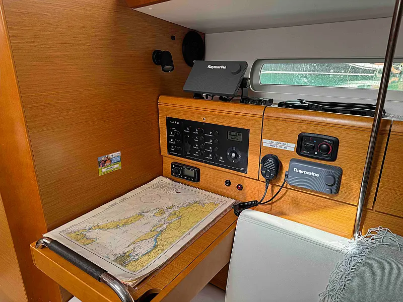 GPS + CHART PLOTTER IN COCKPIT, Inverter 12/220V 50HZ-2000VA, Cockpit cushions, Dinghy, Electric toilets, Fans in saloon and cabins, Webasto heating, Cockpit speakers, Bilge pump + handle, Charts, Hand bearing compass, Binoculars, Life jackets, First aid kit, Barometer, VHF, Radio CD player, Electric windlass, Wind instrument, Winch handles (2), Fenders (8), Air conditioning, Teak cockpit, Bow thruster, Cockpit table, Roll Genoa, Bimini top, Sprayhood, Autopilot, Bathing platform, Indoor speakers, Water heater, Cockpit shower, Gangway, Kitchen utensils (Galley equipment, cutlery), Oven, Refrigerator, Gas cookers, Semi full batten main sail, Gennaker