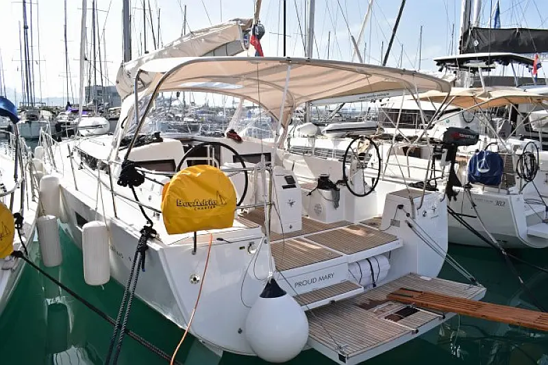 GPS + CHART PLOTTER IN COCKPIT, Bed linen, Dinghy, VHF, Radio CD player, Bow thruster, Roll Genoa, Bimini top, Sprayhood, Autopilot, Bathing platform, Water heater, Cockpit shower, Semi full batten main sail