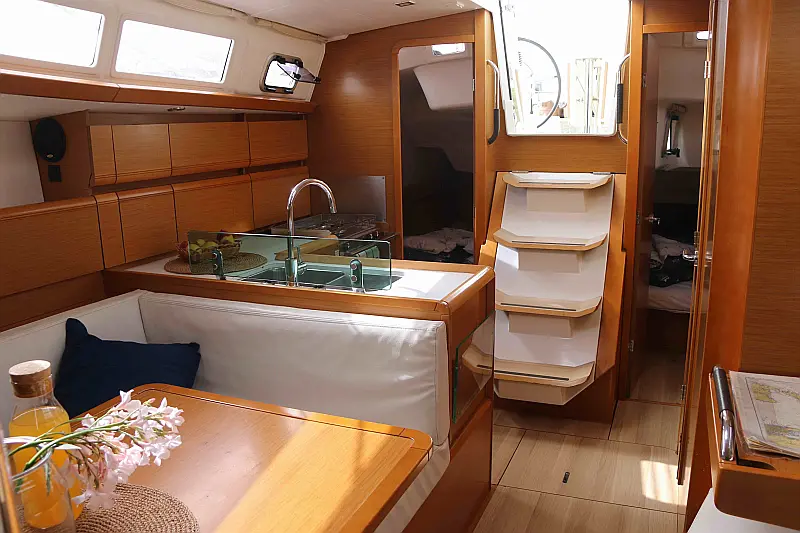 GPS + CHART PLOTTER IN COCKPIT, Inverter 12/220V 50HZ-2000VA, Cockpit cushions, Dinghy, Electric toilets, Fans in saloon and cabins, Webasto heating, Cockpit speakers, Bilge pump + handle, Charts, Hand bearing compass, Binoculars, Life jackets, First aid kit, Barometer, VHF, Radio CD player, Electric windlass, Wind instrument, Winch handles (2), Fenders (8), Air conditioning, Teak cockpit, Bow thruster, Cockpit table, Roll Genoa, Bimini top, Sprayhood, Autopilot, Bathing platform, Indoor speakers, Water heater, Cockpit shower, Gangway, Kitchen utensils (Galley equipment, cutlery), Oven, Refrigerator, Gas cookers, Semi full batten main sail, Gennaker