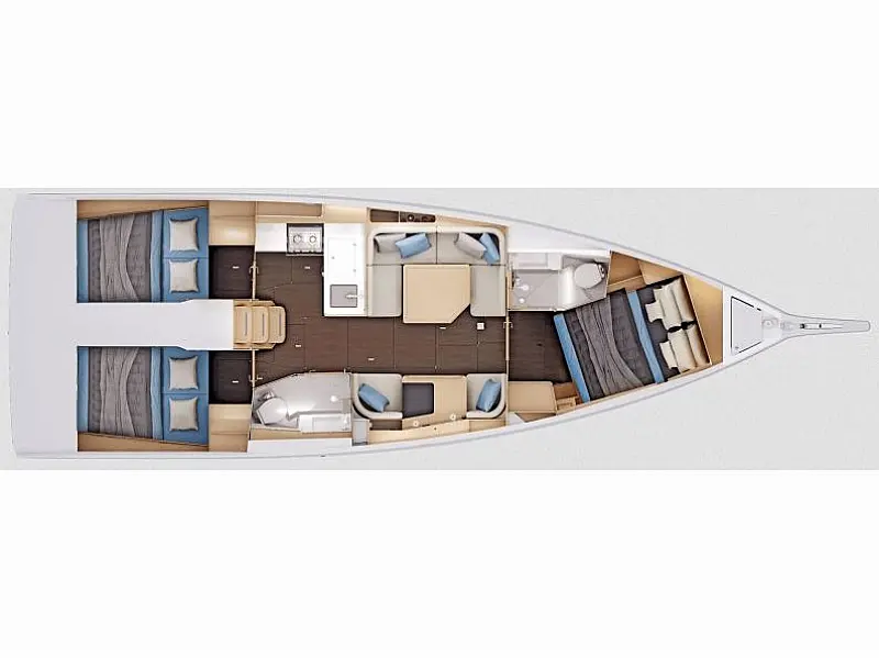 Wireless handset for Raymarine vhf at helm station, Electric windlass, Cockpit table, Profurl genoa furler, Cockpit bimini, Stemhead fitting, GRP cockpit table, Wooden helm seat extensions, Roll genoa, Classic mainsail, Seawater/freshwater foot pump, 220V shore power, USB plugs, 60A battery charger, Extra batteries, Fans, Shades, Wine storage locker under floorboards